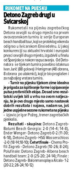 Detono Zagreb: Djevojke su odlično započele turnir i pobjedile ekipe LKZ Beachteama, Plauschcheibe dok su budućim pobjednicama, ekipi Beachqueensa uspjele ugrabiti set, osvojivši jedan bod. No, to nije bilo dovoljno za prolazak u polufinale, s obzirom da su djevojke izgubile od starijih i iskusnijih protivnica, ekipe Wyfelder Sandfroshe, čime su ostale bez prolaska u polufinale. S obzirom na mladost djevojaka nema im se što zamjeriti – bitnije je da su pokazale da s pravim pristupom mogu postići štogod požele. Za nadati je da će se mlade snage uskoro razviti u nositeljice igara, za što je otrebno naravno mnogo rada. No, bitno je znati da potencijal postoji.